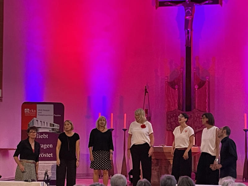 Unterstützt wurde das VkA Hospiz- und Palliativzentrum Pauline, das im Garten der Schwestern entstehen wird. Vor zahlreichen Besuchern bot der achtköpfige Chor eine einzigartige Vorstellung untermalt mit gelungener Illumination. Chorlieder wechselten mit Duetten. Das Programm bot einen bunten Mix aus Popsongs der letzten 40 Jahre und neu gewandeten Volkliedern wie z. B. „Sah ein Knab ein Röslein stehen“. Viel Applaus gab es auch für die lokalen Ohrwürmer „Paderborner Brot“ und „Pader“.