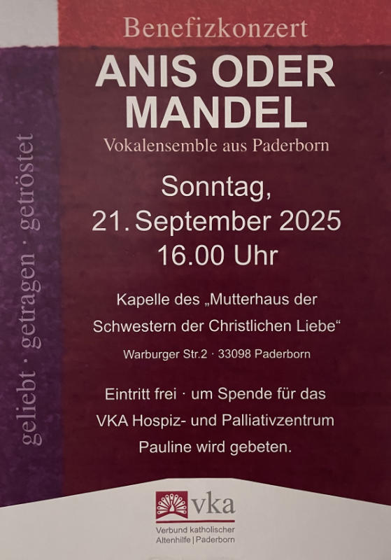 Am Sonntag, den 21. September 2025, gab das Paderborner Vokalensemble „Anis oder Mandel“ in der vollbesetzen Kapelle der Schwestern ein Benefizkonzert.